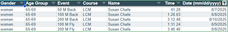 Susan Chafe set 5 new club records while competing at the 2025 USMS Summer Nationals last month. Congratulations!
