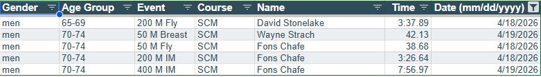 Five new club records were set at the 2026 Masters Provincials in Calgary last weekend (April 18-19, 2026). Congratulations to David Stonelake, Wayne Strach, and Fons Chafe!