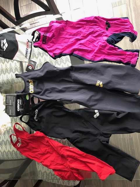 RED SUIT was worn for one meet, selling for $75. Size 24.