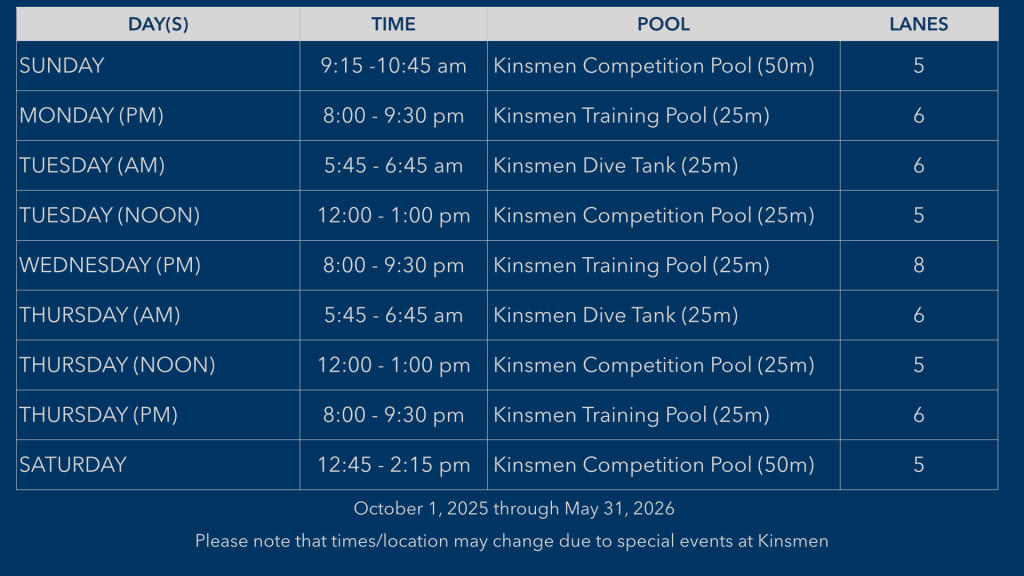 Our 2025-2026 season starts on October 1st. Our schedule for the season is posted. We have lots of lane space and will not be capping membership numbers. (In the summer we are restricted by the outdoor facility capacity)