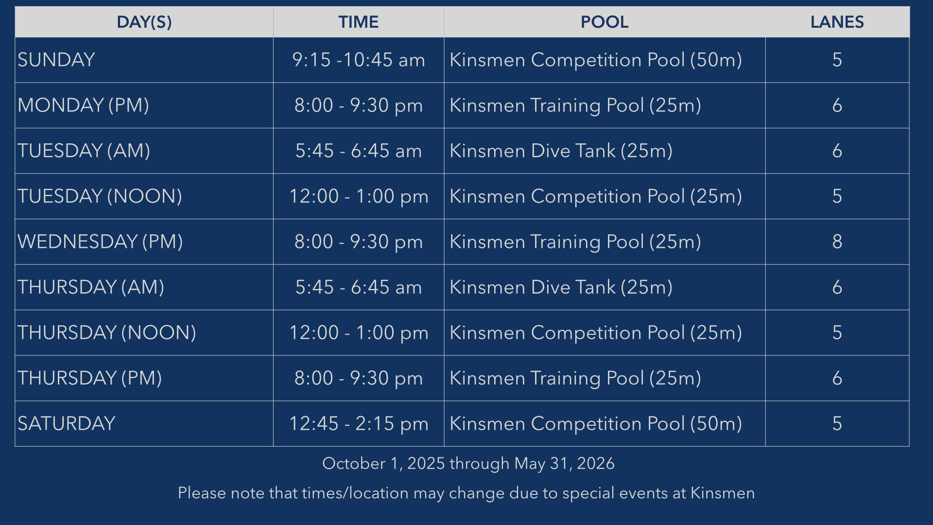 Tuesday, December 30, 2025 – Kinsmen Training Pool – 5:45-6:45am – 3LC